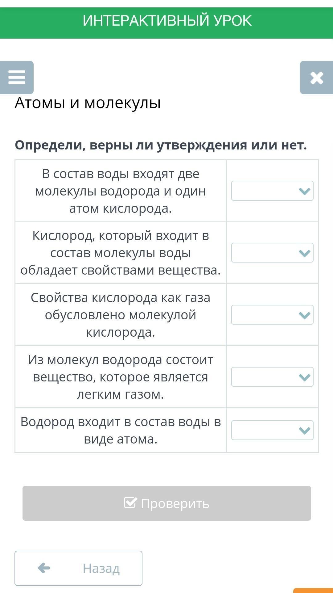 Атомы и молекулы Определи, верны ли утверждения или нет. В состав воды входят две молекулы водорода и один атом кислорода. Кислород, который входит в состав молекулы воды обладает свойствами вещества. Свойства кислорода как газа обусловлено молекулой кислорода. Из молекул водорода состоит вещество, которое является легким газом. Водород входит в состав воды в виде атома. Назад Проверить