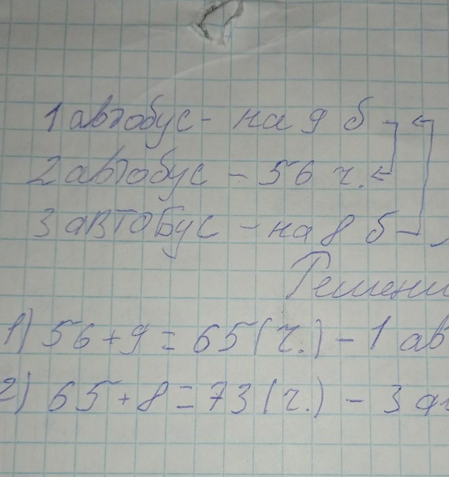 В трёх автобусах 194 пассажира ,причём в 1 автобусе на 9 человек больше чем во втором и на 8 меньше чем в третьем ,причём во втором автобусе едет 56 человек .Сколько человек в каждом автобусе?