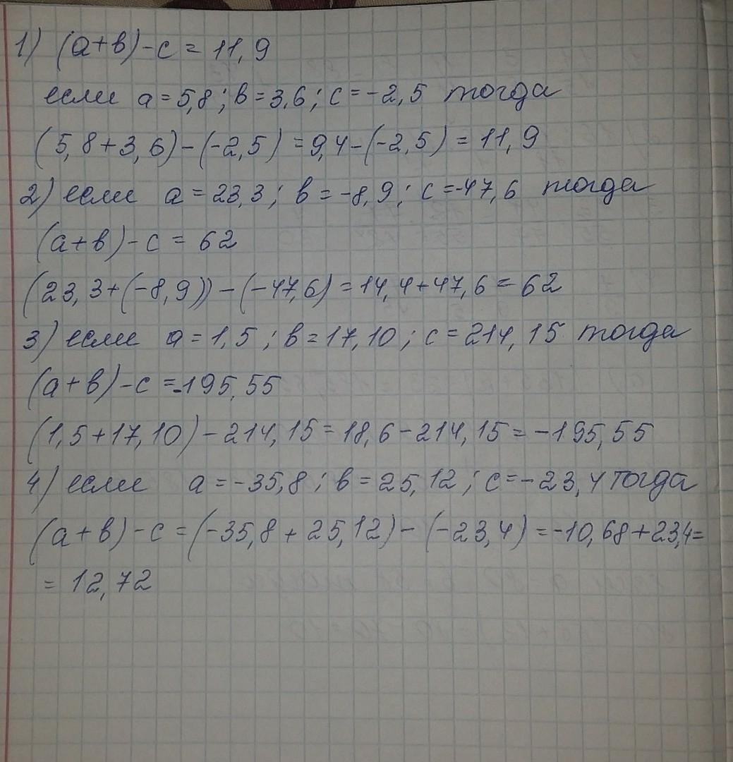 найдите значение выражения ( a+b)- c если a= 5,8; b= 3,6; c= - 2,5;2) a=23,3; b= -8,9;c= -47,6;3) a = 1,5; b=1 7,10; c= 2 14,15; 4) a= - 3 5,8; b= 2 5,12; c= -2 3,4.