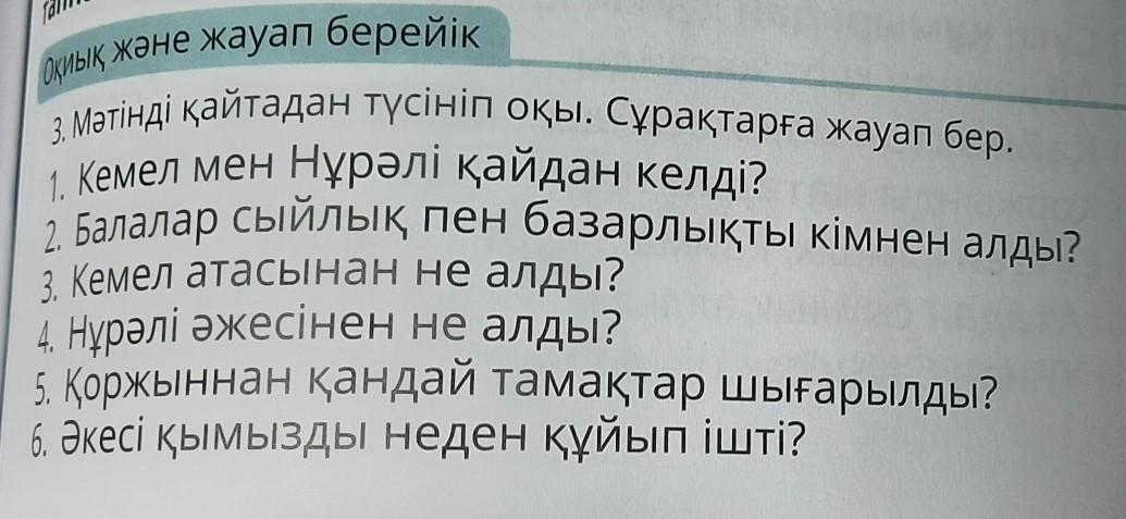әлем улл Оқиық және жауап берейік 3. Мәтінді қайтадан түсініп оқы. Сұрақтарға жауап бер. 1. Кемел мен Нұрәлі қайдан келді? 2. Балалар сыйлық пен базарлықты кімнен алды? 3. Кемел атасынан не алды? 4. Нұрәлі әжесінен не алды? 5. Қоржыннан қандай тамақтар шығарылды? б. Әкесі қымызды неден құйып ішті?