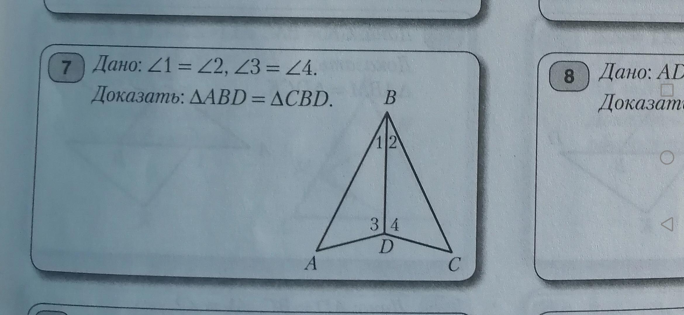 ΔАВД = ΔСВД по второму признаку равенства тре-ков: если сторона и 2 прилежащих к ней угла одного треугольника равны соответственно стороне и двум прилежащим к ней углам другого треугольника, то такие треугольники равны.