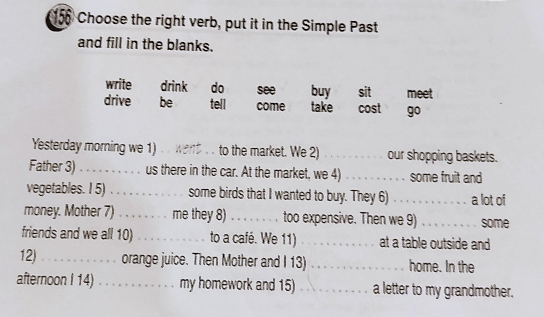 1) went 2)took 3)came 4) bought 5) saw 6) cost 7) told 8) was/were 9) met 10) drove 11) set 12) drank 13) wrote 14) did 15) driven