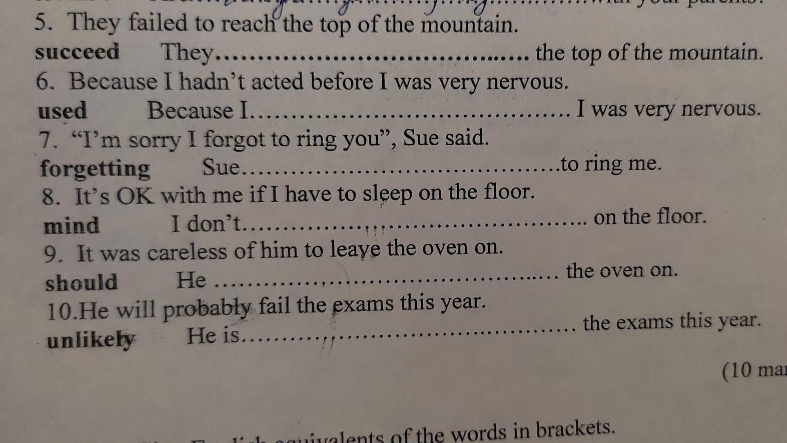 5. They did not succeed the top of the mountain. 6. Because I used not to act before I was very nervous. 7. Sue said that she was forgetting to ring me. 8. I don't mind to sleep on the floor. 9. She should be careless to leave the oven on. 10. He is unlikely failing the exam this year.