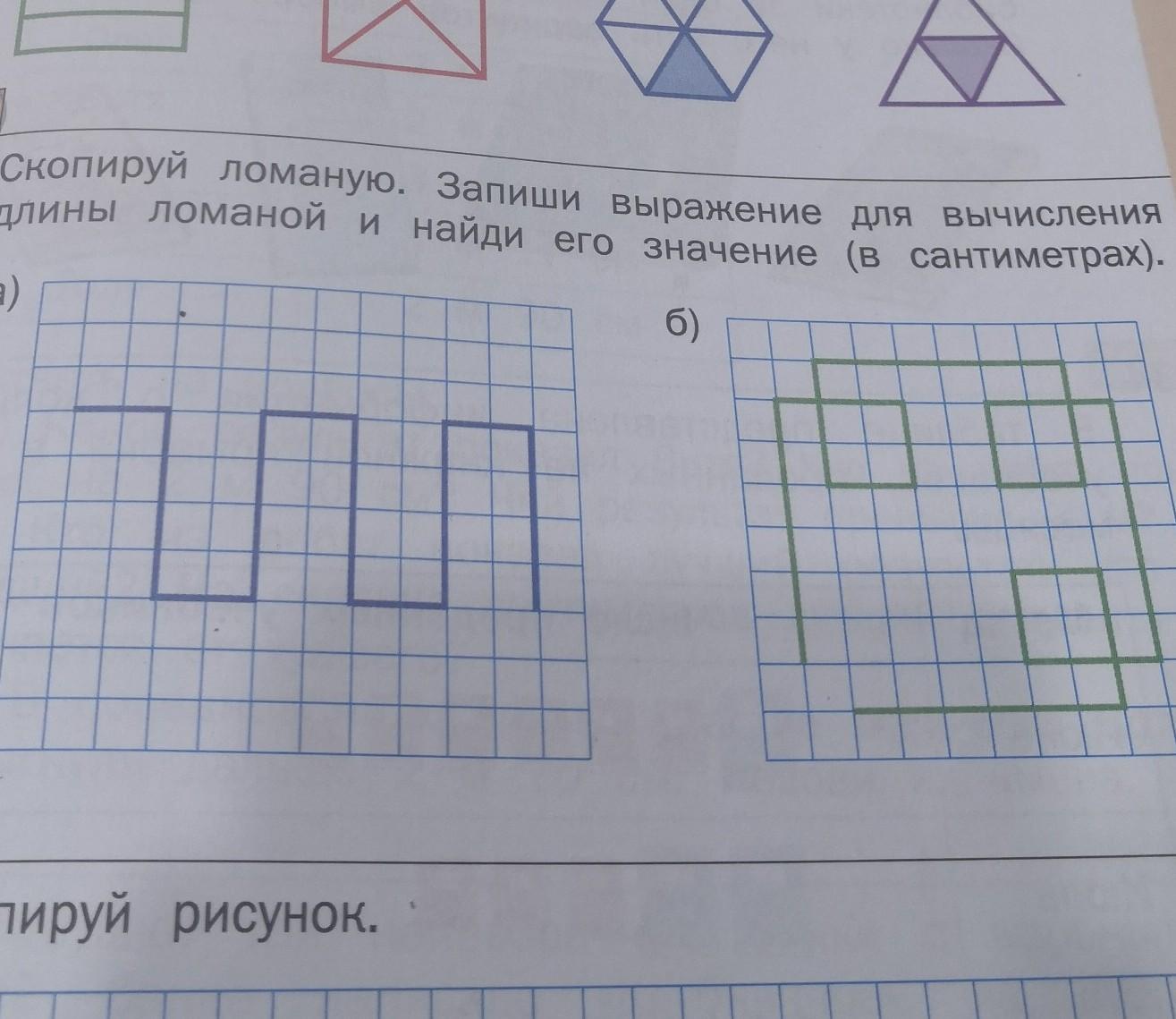 Скопируй ломаную. Запиши выражение для вычисления длины ломаной и найди его значение (в сантиметрах). a) 6) Скопируй рисунок