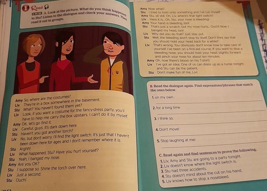 B. Read the dialogue again. Find expressions/phrases that match the ones below. 1. on my own 2. for a long time 3. I think so. 4. Don't move! 5. Stop laughing at me!