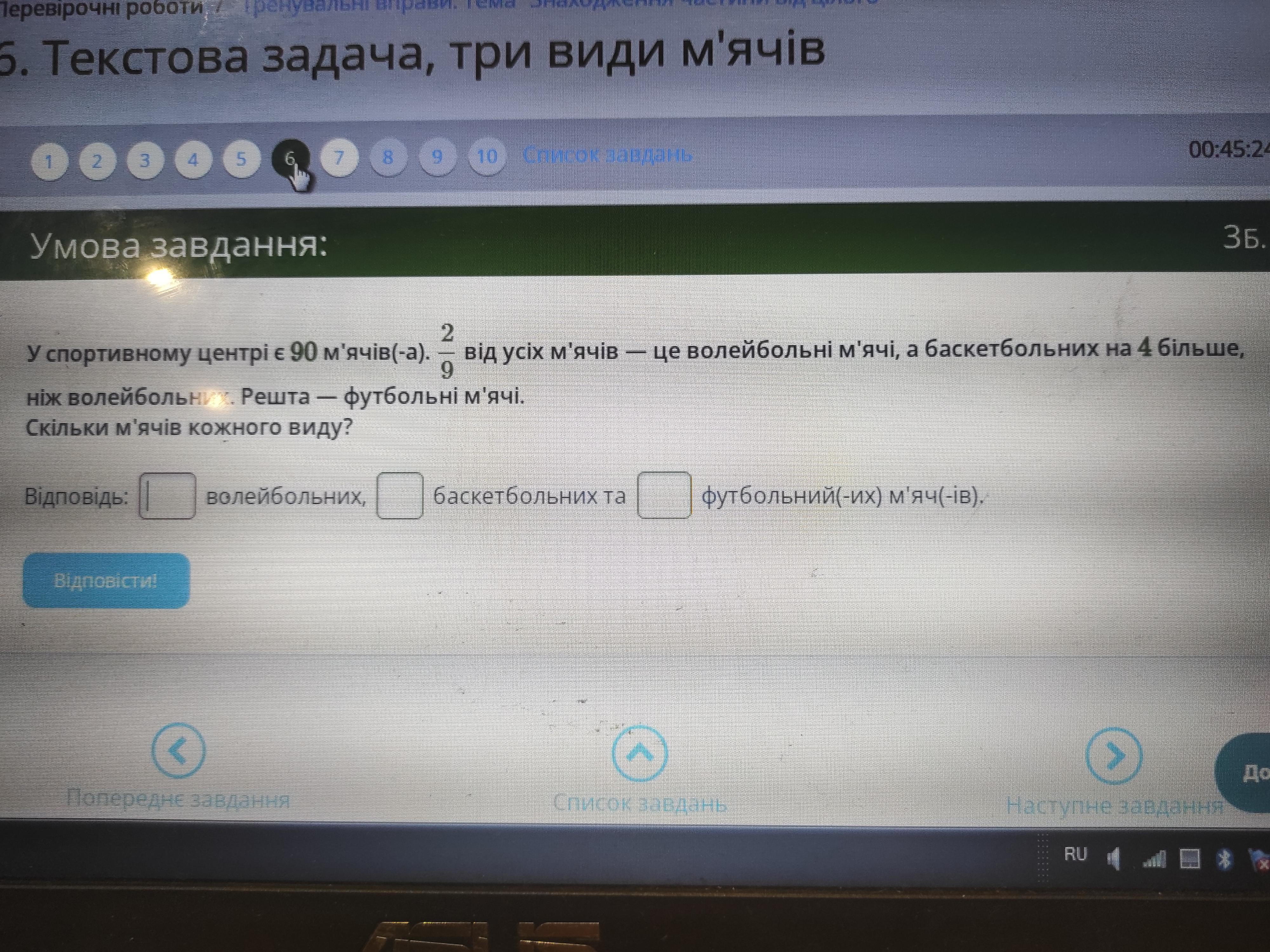 90:9•2=10•2=20 (м’ячів )-волейбольних м’ячів