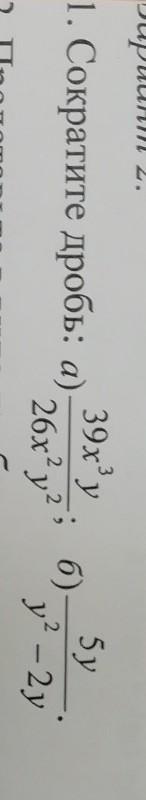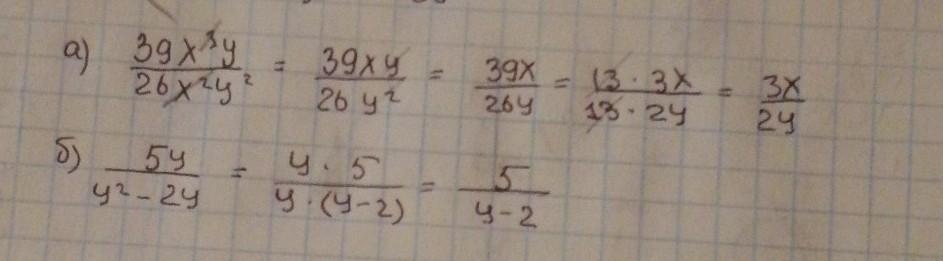 В первом получается, что мы делим сначала х^3 на х^2 и получаем просто х. Потом у^2 делим на у и также получаем просто у. Там уже находим общий делитель 39 и 26 и выносим его. Сокращаем.