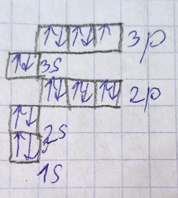 Напишіть графічну електронну формулу атома Хлору. Скільки в ній: а) спарених електронів; б) неспарених електронів; в) 5-електронів; г) р-електронів?