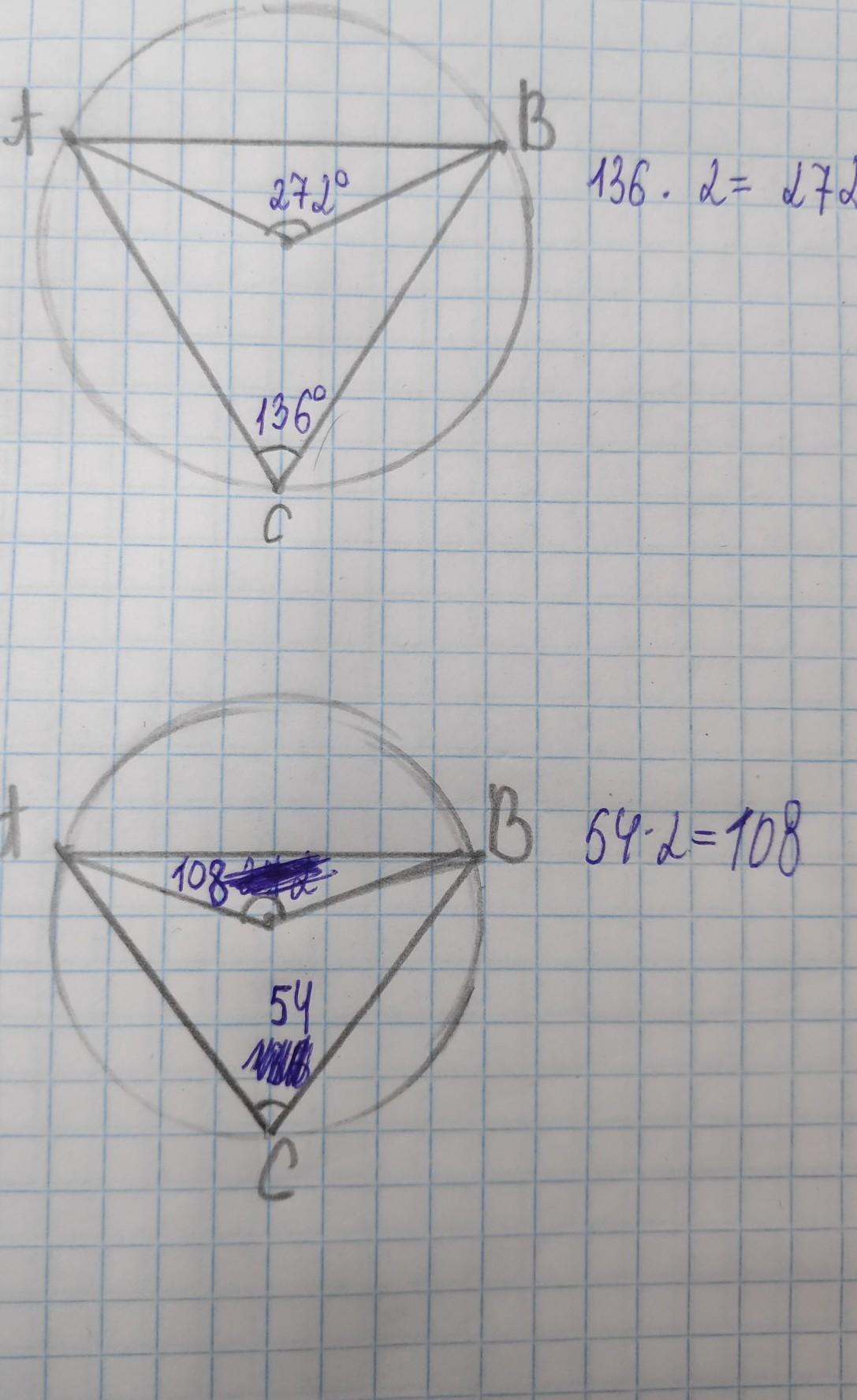 Навколо трикутника АВС описано коло з центром у точці О. Знайдіть кут АОВ, якщо:1) кут С=54°; 2) кут С=136°