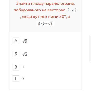Площадь параллелограмма: S=[xy] (векторное произведение)=|x|*|y|*sin(x,y)= 2* sin(30°)=2*1/2=1