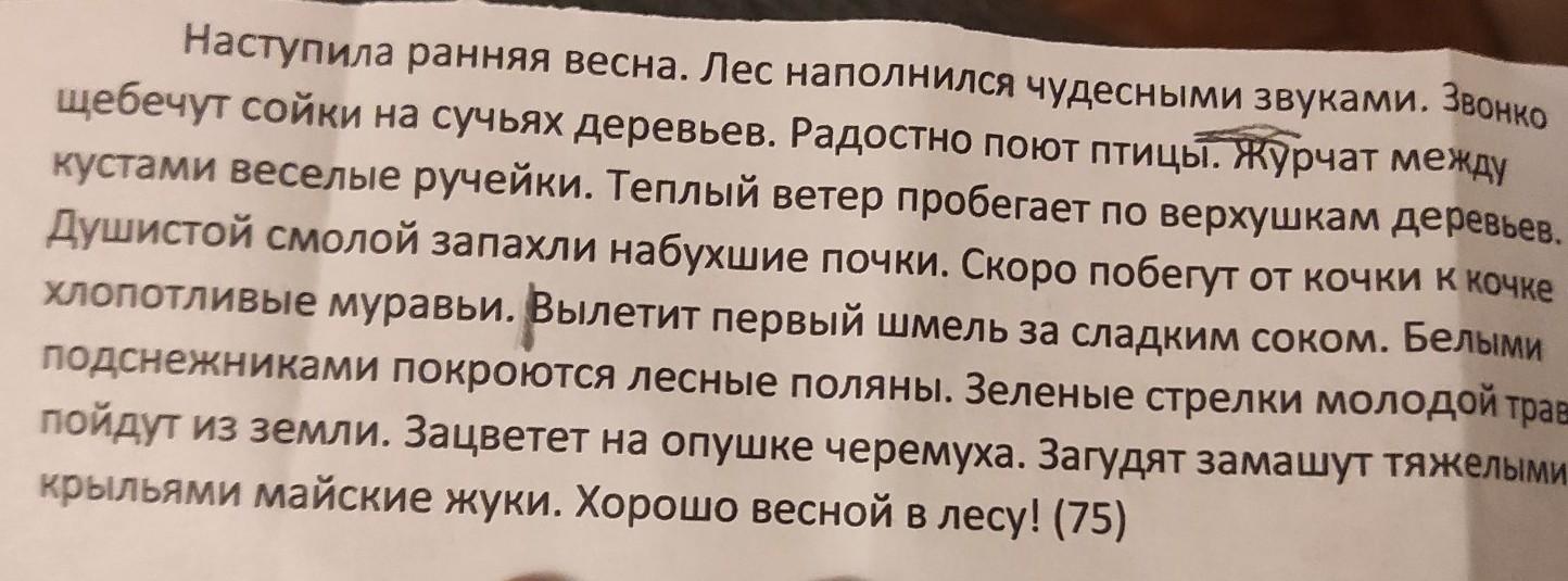 ранняя весна, наполнился звуками, чудесными звуками, звонко щебечут, щебечут на сучьях деревьев, радостно поют, журчат между кустами, веселые ручейки, теплый ветер, пробегает по верхушкам деревьев, душистой смолой, запахли смолой, набухшие почки, скоро побегут, побегут от кочки к кочке, хлопотливые муравьи, первый шмель, сладким соком, вылетит за соком, белыми подснежниками, покроются подснежниками, лесные поляны, зеленые стрелки, молодой травы, пойдут из земли, зацветет черемуха, зацветет на опушке, загудят крыльями, замашут крыльями, тяжелыми крыльями, майские жуки, хорошо весной, хорошо в лесу (вроде все)
