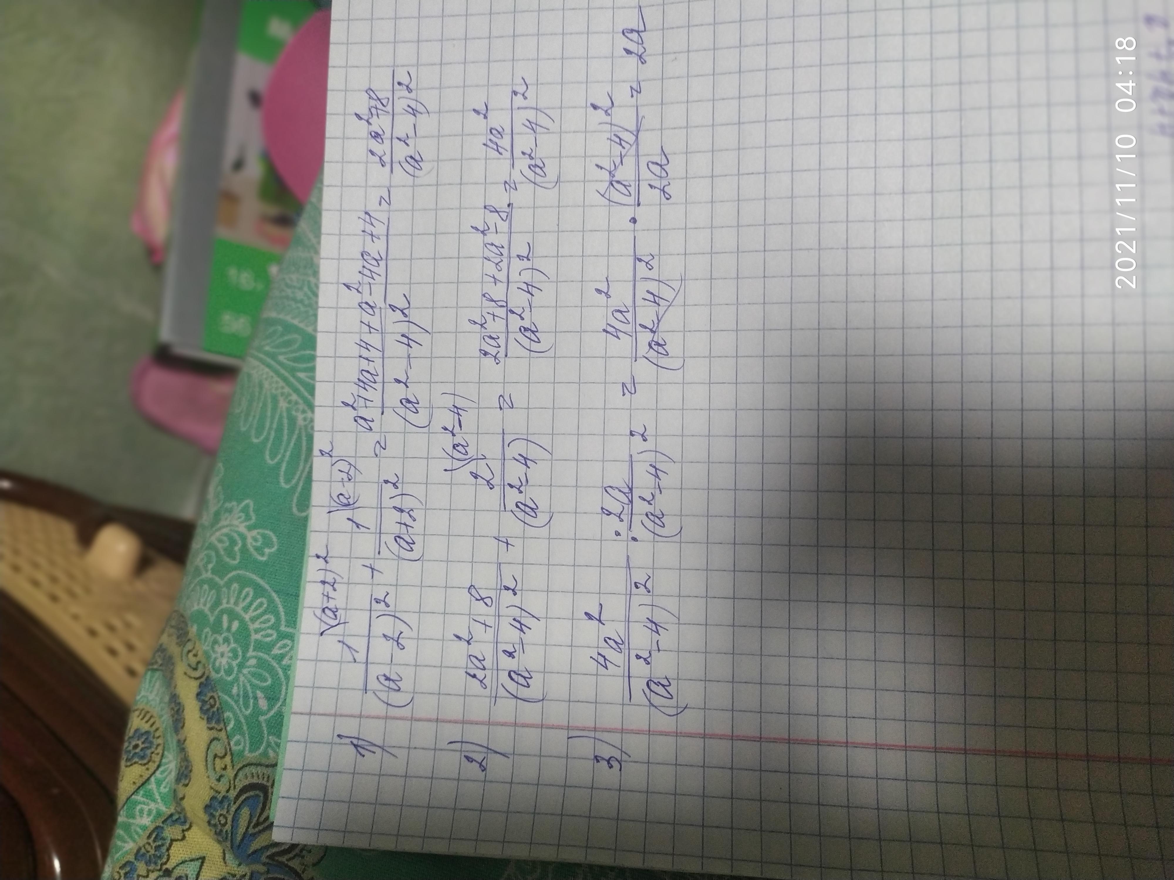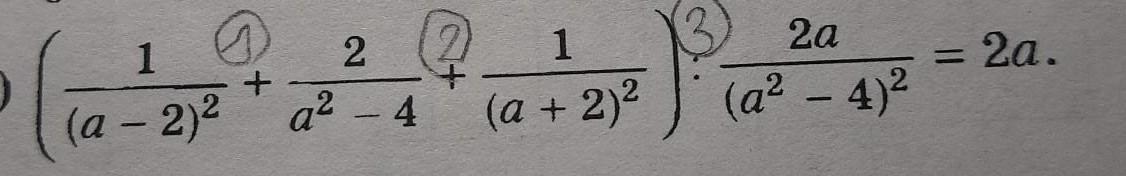 Докажите тождество: ( 1 (a-2)^ 2 + 2 a^ 2 -4 + 1 (a+2)^ 2 ): 2a (a^ 2 -4)^ 2 =2a.