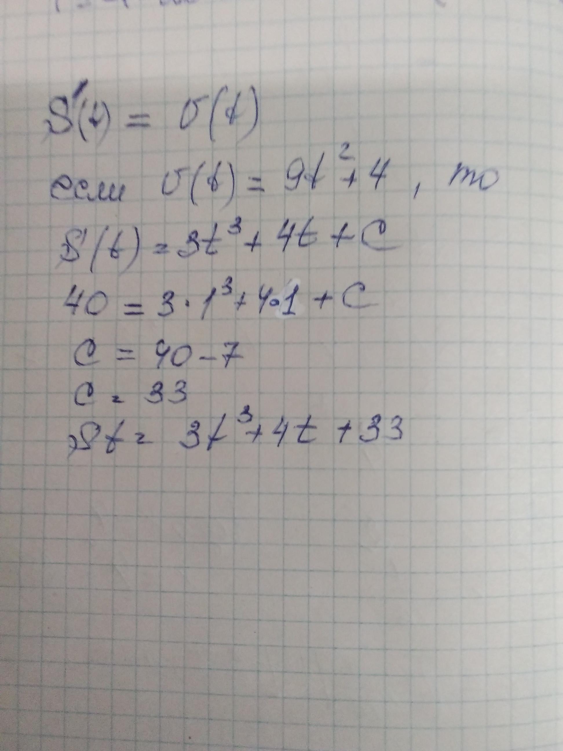 Швидкість матеріальної точки, що рухається прямолінійно, змінюється за законом v(t) = 9t ^ 2 + 4 Запишіть формулу залежності координати точ ки вiд часу, якщо відомо, що в мо мент часу t = 1 с точка знаходилась на відстані s = 40 м від початку ко ординат (швидкість руху вимірюєть ся в м/с)