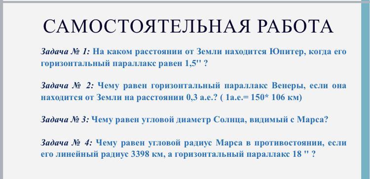 Объяснение: 1. Расстояние (S) до наблюдаемого объекта, с известным горизонтальным параллаксом (p''), можно найти по формуле S = 206265''*Rз/p'', здесь 206265'' – количество угловых секунд в одном радиане; Rз – радиус Земли = 6371 км; p'' = параллакс наблюдаемого объекта, в угловых секундах. Следовательно, расстояние до Юпитера S = 206265'' * 6371км/1,5'' = 876076210 км.