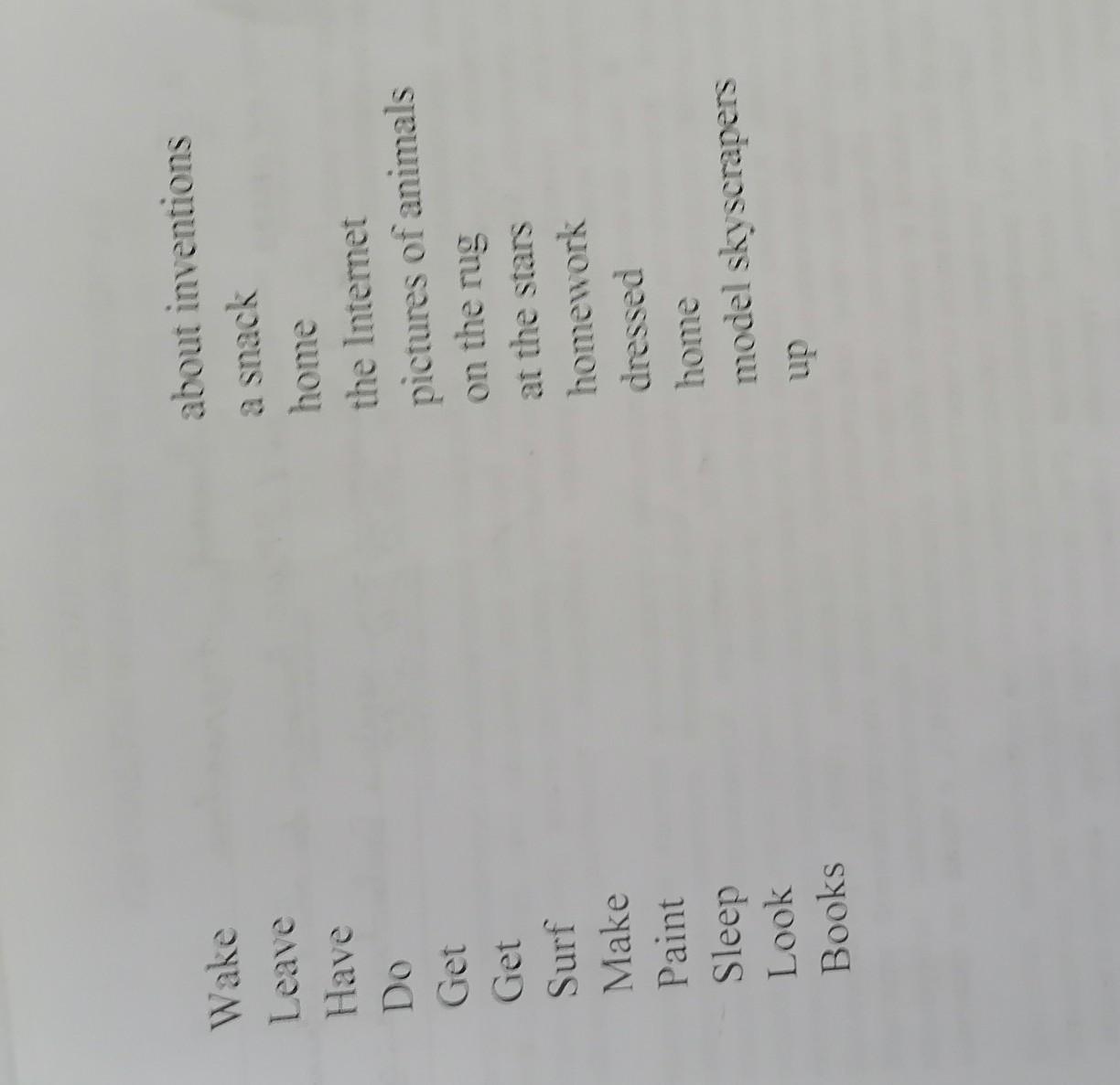 wake up, do homework, look at the stars, get on the rug, get home, surf the internet, paint pictures of animals, leave home, books about inventions, have a snack, make model skyscrapers, sleep dressed