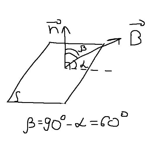 Угол между вектором магнитной индукции и плоскостью контура 30°. Определите угол между вектором магнитной индукции и положительной нормалью к контуру.