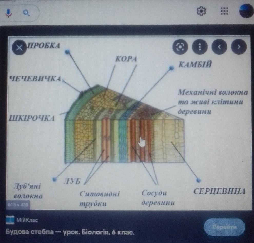 2. Якi частини мае поперечний розрiз стовбура дерева?