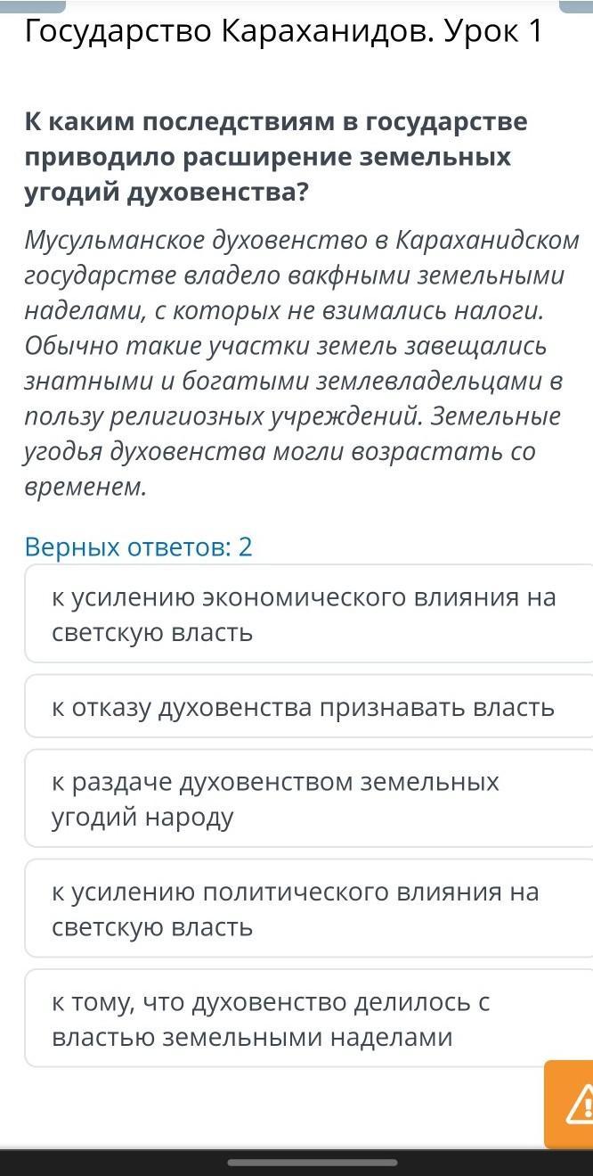 Государство Караханидов. Урок 1 К каким последствиям в государстве приводило расширение земельных угодий духовенства? Мусульманское духовенство в Караханидском государстве владело вакфными земельными наделами, с которых не взимались налоги. Обычно такие участки земель завещались знатными и богатыми землевладельцами в пользу религиозных учреждений. Земельные угодья духовенства могли возрастать со временем. Верных ответов: 2 к усилению экономического влияния на светскую власть котказу духовенства признавать власть к раздаче духовенством земельных угодий народу к усилению политического влияния на светскую власть к тому, что духовенство делилось с властью земельными наделами