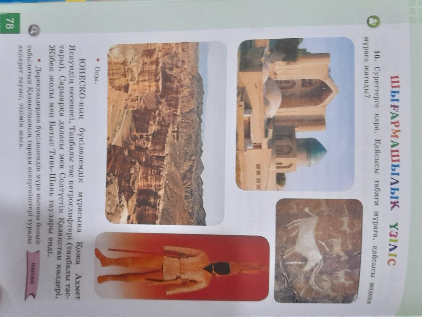 ШЫҒАРМАШЫЛЫК ҮЗІЛІС 16. Суреттерге қара. Қайсысы табиғи мұраға, қайсысы чате мұраға жатады? а • Оқы. ЮНЕСКО-ның бүкіләлемдік мұрасына Қожа Ахмет Ясауидің кесенесі, Таңбалы тас петроглифтері (таңбалы тас- тары), Сарыарқа даласы мен Солтүстік Қазақстан көлдері, Жібек жолы мен Батыс Тянь-Шань таулары енді. • Дереккөздерден бүкіләлемдік мұра нысаны болып табылатын Қазақстанның тарихи ескерткіштері туралы ақпарат тауып, тізімін жаса. Пожалустааааааааааа срочнооооооо