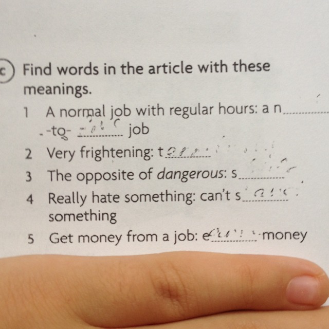 1 nine-to-five 2 terrible 3 safe 4 stand 5 earn