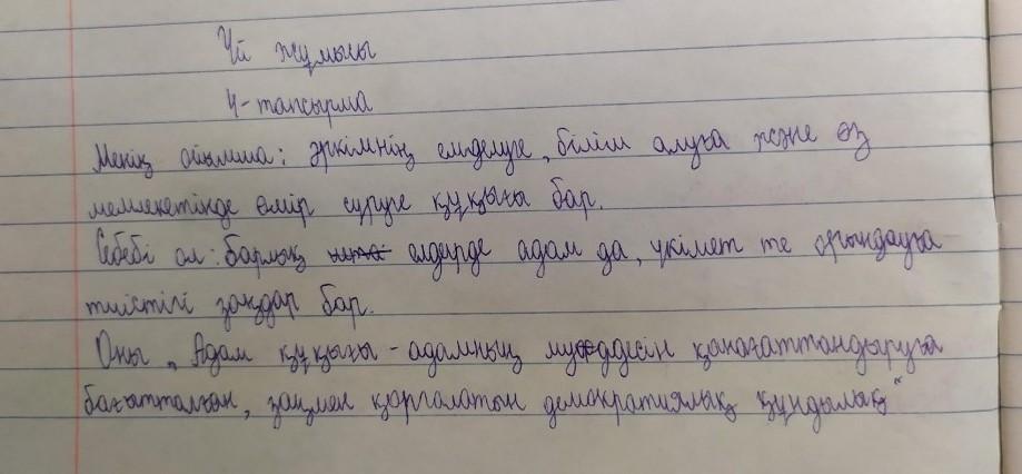 4-тапсырма. «Төрт сөйлем». Тыңдалған мәтіндегі ақпарат бойынша өз пікіріңді дәлелдеп жаз. Пікіріңді құрмалас салалас сөйлем түрінде құра. Бірінші сөйлем: Менің ойымша, ... . Екінші сөйлем: Себебі ол ... . Үшінші сөйлем: Оны «...» сияқты деректермен, мысалдармен дәлелдей аламын. Төртінші сөйлем: «Осыған байланысты мен «...» деген шешімге келдім.