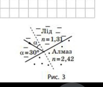 Світло переходить iз льоду в алмаз. На рис. 3 наведено падаючий промінь, задано кут падіння, зазначено абсолютні показники залом лення середовищ. Визначте синус кута заломлення.