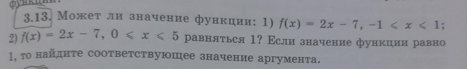 3.13. Может ли значение функции: 1) f(x) = 2х – 7, -1 < x < 1; 2) f(x) = 2х — 7, o < x < 5 равняться 1? Если значение функции равно 1, то найдите соответствующее значение аргумента.