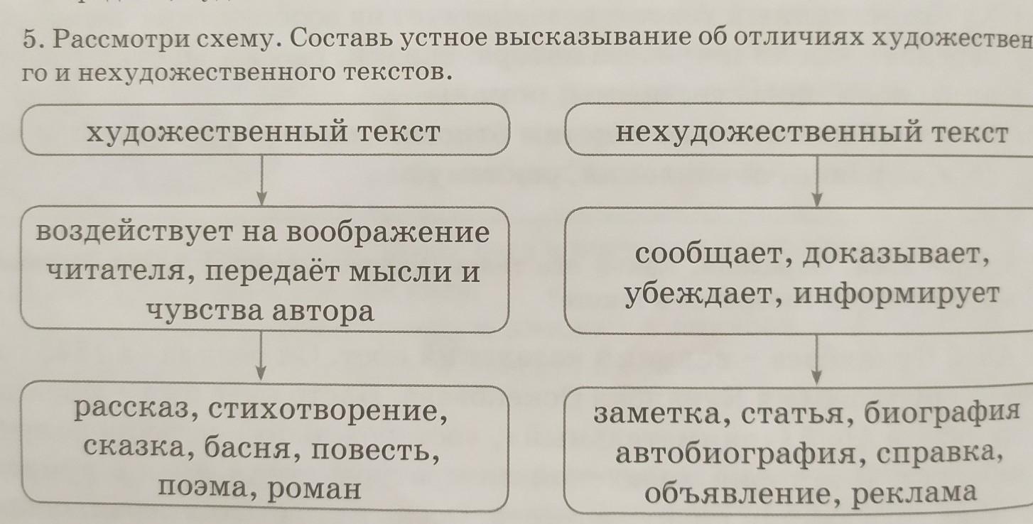 5. Рассмотри схему. Составь устное высказывание об отличиях художественно- го и нехудожественного текстов. нехудожественный текст художественный текст воздействует на воображение читателя, передаёт мысли и чувства автора сообщает, доказывает, убеждает, информирует рассказ, стихотворение, сказка, басня, повесть, поэма, роман заметка, статья, биография автобиография, справка, объявление, реклама