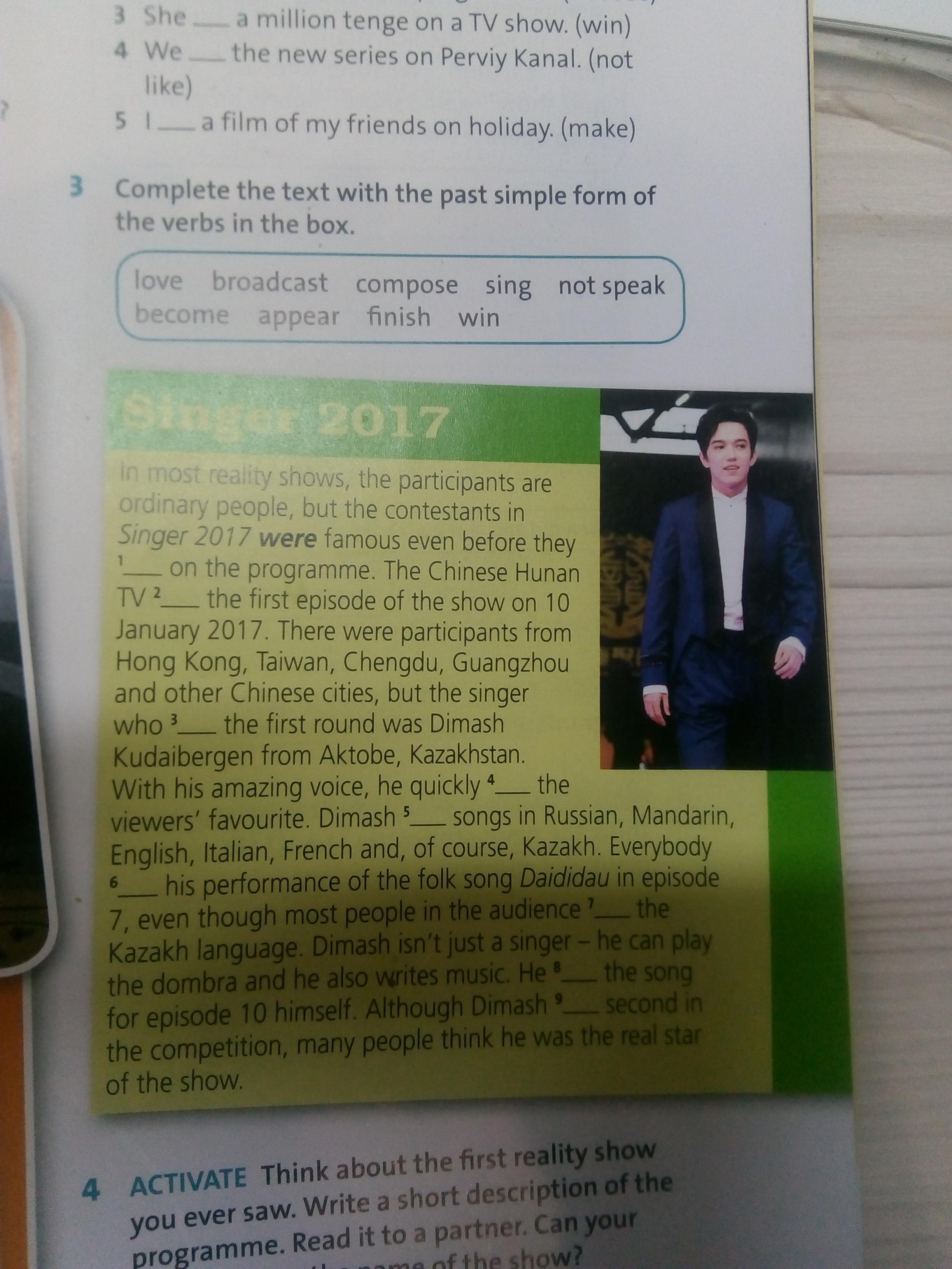 In most reality shows, the participants are ordinary people, but the contestants in Singer 2017 were famous even before they appeared on the programme. The Chinese Hunan TV broadcast the first episode of the show on 10 January 2017. There were participants from Hong Kong, Taiwan, Chenghu, Guangzhou and other Chinese citites, but the singer who won the first round was Dimash Kudaibergen from Aktobe, Kazakhstan. With his amazing voice, he quickly became the viewers favourite. Dimash sang songs in Russian, Mandarin, English, Italian, French and, of course, Kazakh. Everybody loved his performance of the folk song Daididau in episode 7, even though most people in the audience didn't speak the Kazakh language. Dimash isn't just a singer - he can play the dombra and he also writes music. He composed the song for episode 10 himself. Although Dimash finished second in the competition, many people thins he was the real star of the show.