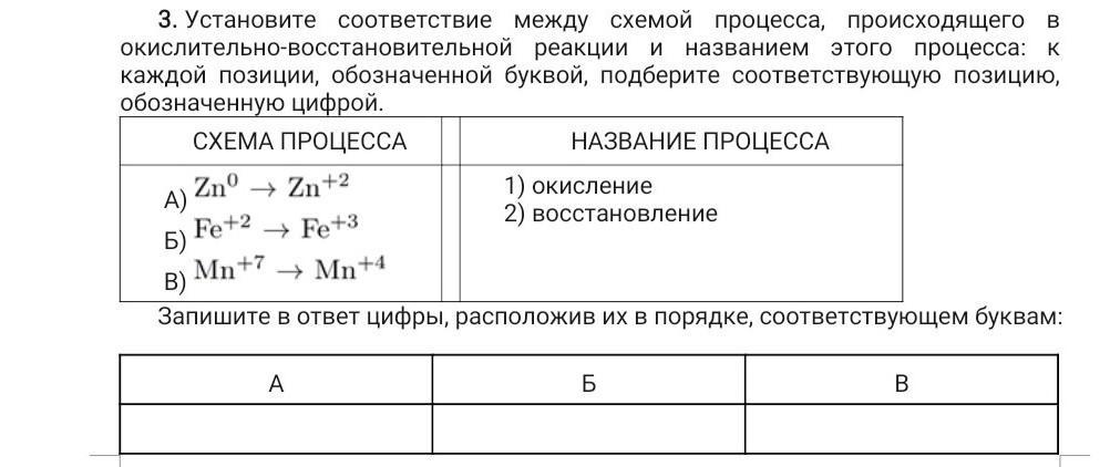 Установите соответствие между схемой процесса, происходящего в окислительно-восстановительной реакции и названием этого процесса: к каждой позиции, обозначенной буквой, подберите соответствующую позицию, обозначенную цифрой.