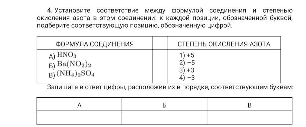 Установите соответствие между формулой соединения и степенью окисления азота в этом соединении: к каждой позиции, обозначенной буквой, подберите соответствующую позицию, обозначенную цифрой.
