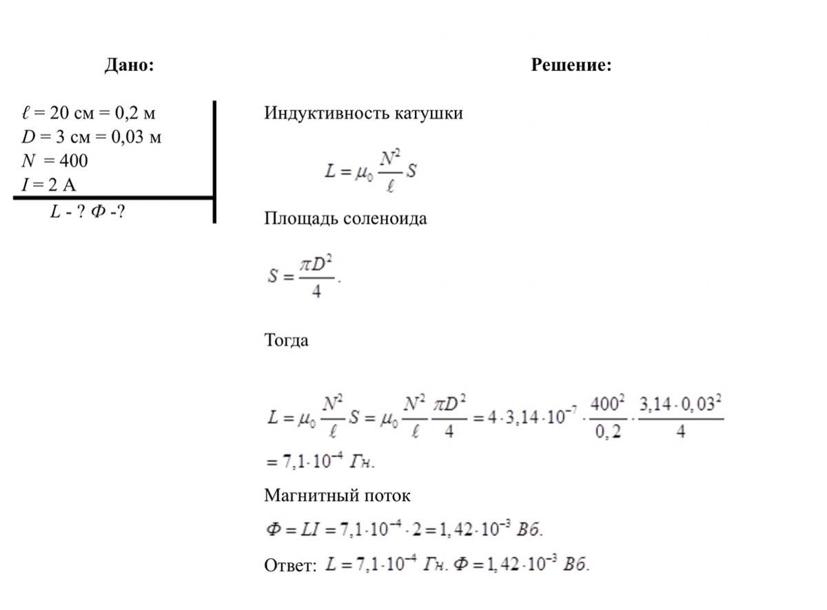 По катушке длиной 20 см и диаметром 3 см, имеющей 400 витков, течет ток 2 А. Найти индуктивность катушки и магнитный поток, пронизывающий ее сечение.