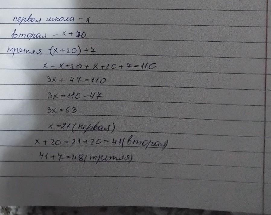 три школы получили 110 компьютеров . вторая школа на 20 компьютеров больше первой, а третья на 7 компьютеров больше второй, сколько компьютеров получила каждая школа