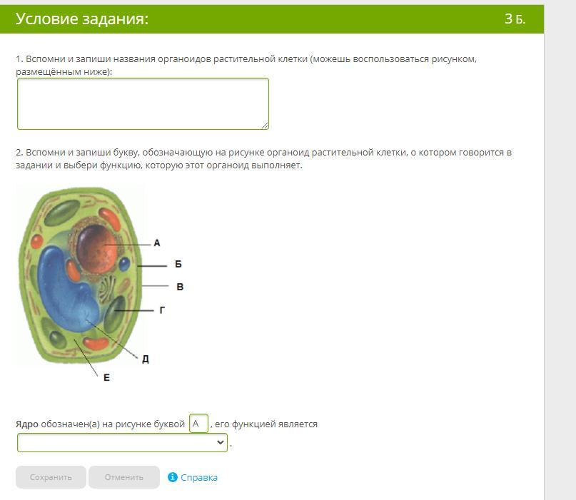 2. Вспомни и запиши букву, обозначающую на рисунке органоид растительной клетки, о котором говорится в задании и выбери функцию, которую этот органоид выполняет.
