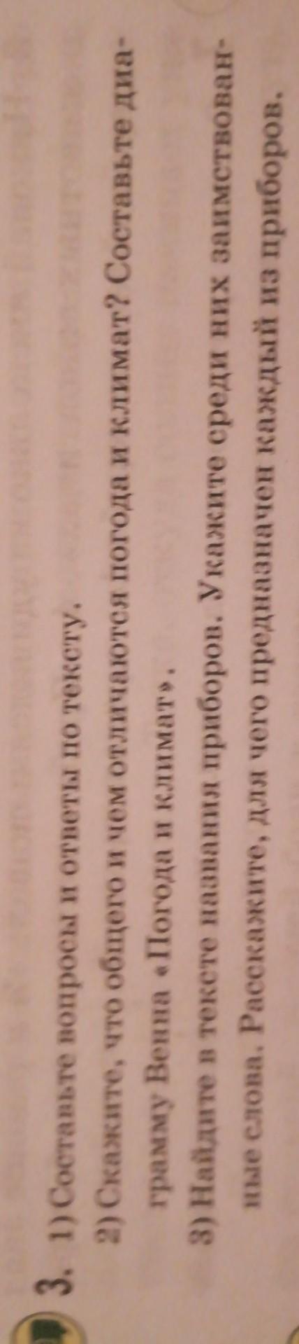 3. 1) Составьте вопросы и ответы по тексту. 2) Скажите, что общего и чем отличаются погода и климат? Составьте диа- грамму Венна «Погода и климат». 3) Найдите в тексте названия приборов. Укажите среди них заимствован- ные слова. Расскажите, для чего предназначен каждый из приборов.