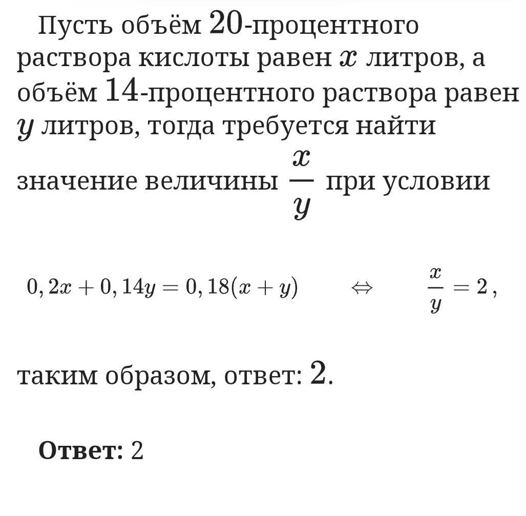 Во сколько раз объем 20% раствора кислоты должен быть больше объема 14% раствора той же кислоты, чтобы получить 18% раствор при смешивании? помогите пожалуйста