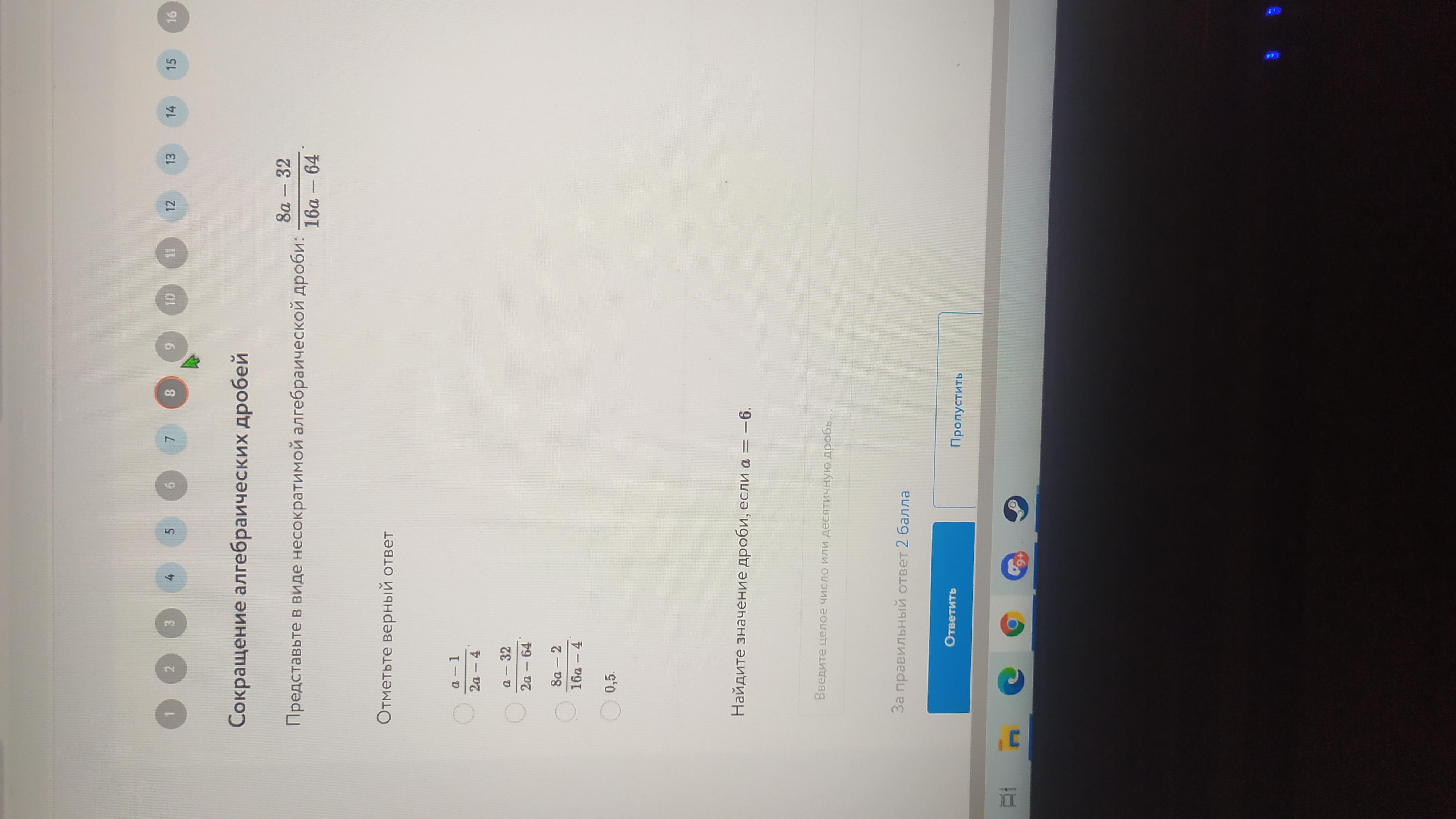Представьте в виде несократимой алгебраической дроби 8a-32/16a-64