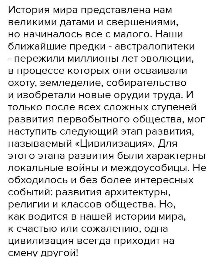 История мира представлена нам великими датами и свершениями, но начиналось все с малого. Наши ближайшие предки - австралопитеки - пережили миллионы лет эволюции, в процессе которых они осваивали охоту, земледелие, собирательство и изобретали новые орудии труда. И только после всех сложных ступеней развития первобытного общества, мог наступить следующий этап развития, называемый «Цивилизация». Для этого этапа развития были характерны локальные войны и междоусобицы. Не обходилось и без более интересных событий: развития архитектуры, религии и классов общества. Но, как водится в нашей истории мира, к счастью или сожалению, одна цивилизация всегда приходит на смену другой!