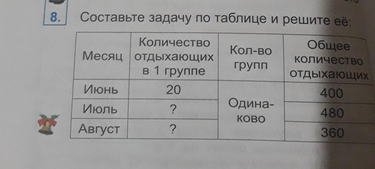 8. Составьте задачу по таблице и решите её Количество Месяц отдыхающих в 1 группе Июнь 20 Кол-во групп Общее количество отдыхающих 400 480 360 Июль ? Одина- КОВО Август ?