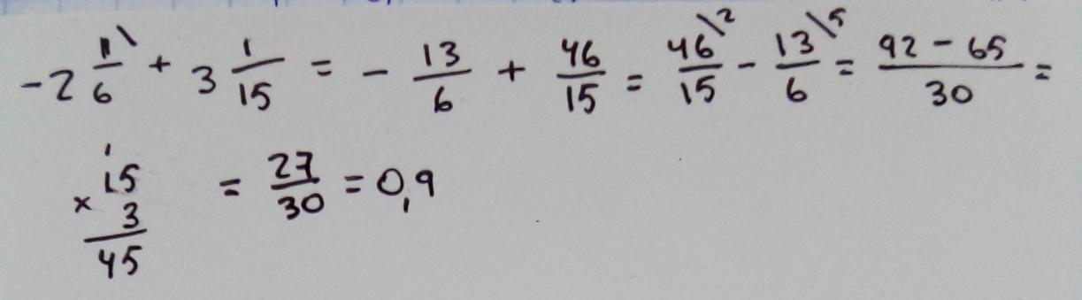 -2 1/6 + 3 1/15 = -2 5/30 + 3 2/30 = 27/30 = 9/10
