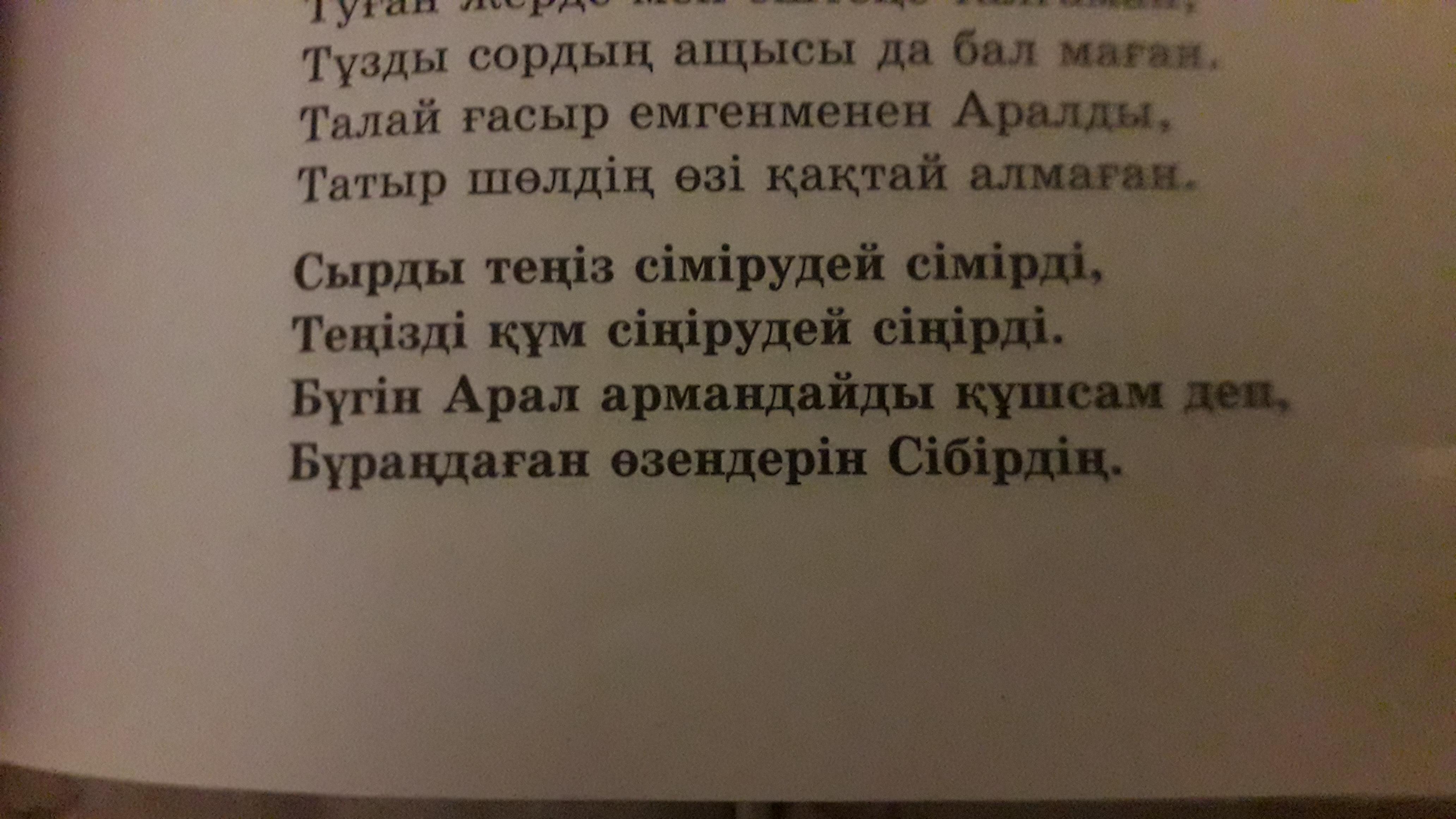 Өлеңде Арал теңізінің тартылуы,экологияға нұқсан келтіргені, ауыз су тапшылығы, қуаңшылық туралы айтылған. Қандай да бір өзгеріс болып, Арал теңізінің суы артады деп үміттенеді.