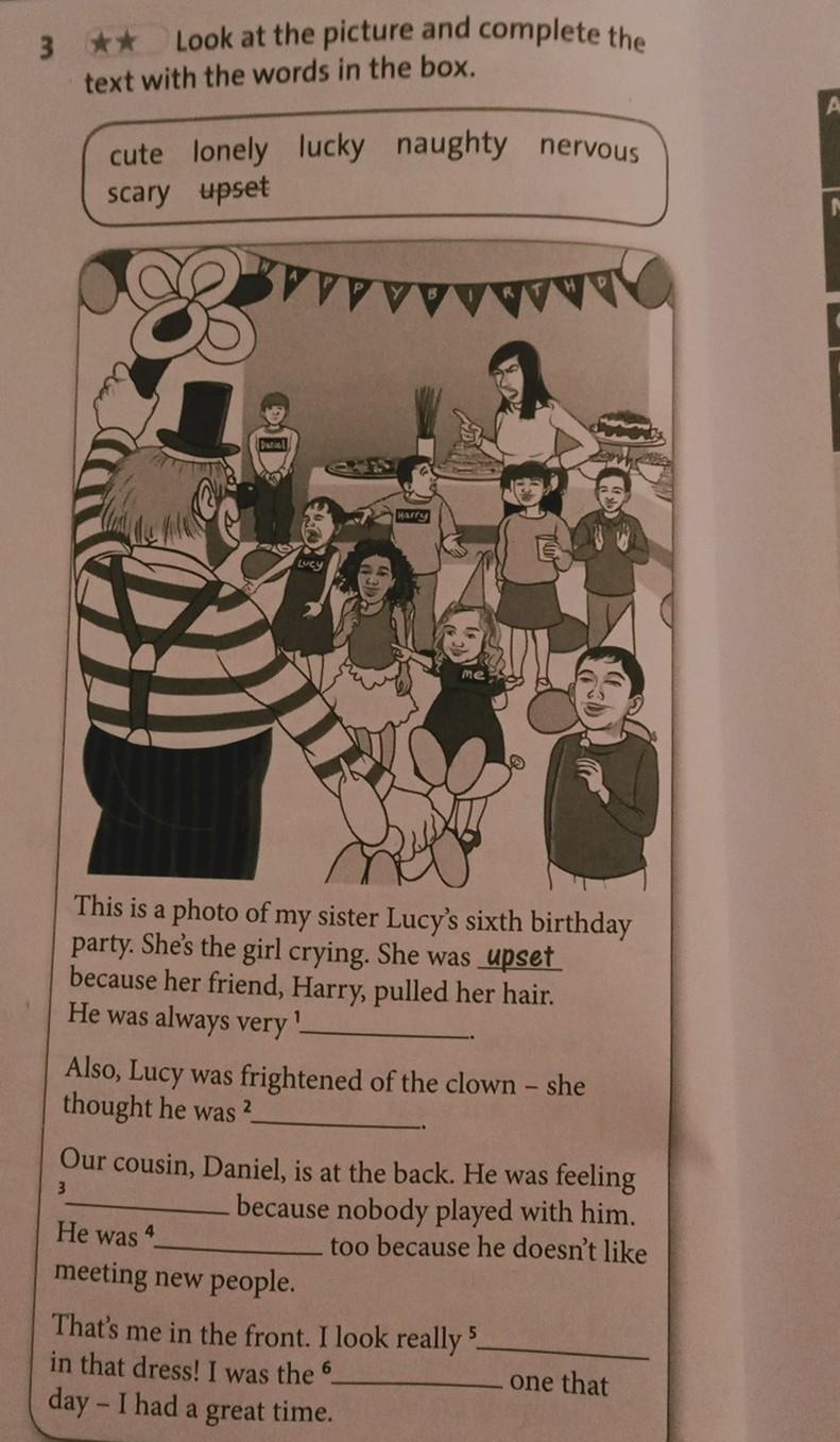 1 This is a photo of my sister Lucy's sixth birthday party. She's the girl crying. She was upset because her friend, Harry, pulled her hair. He was always very! Also, Lucy was frightened of the clown - she thought he was 2 3 Our cousin, Daniel, is at the back. He was feeling because nobody played with him. He was too because he doesn't like meeting new people. 4 5 That's me in the front. I look really in that dress! I was the 6 day - I had a great time.