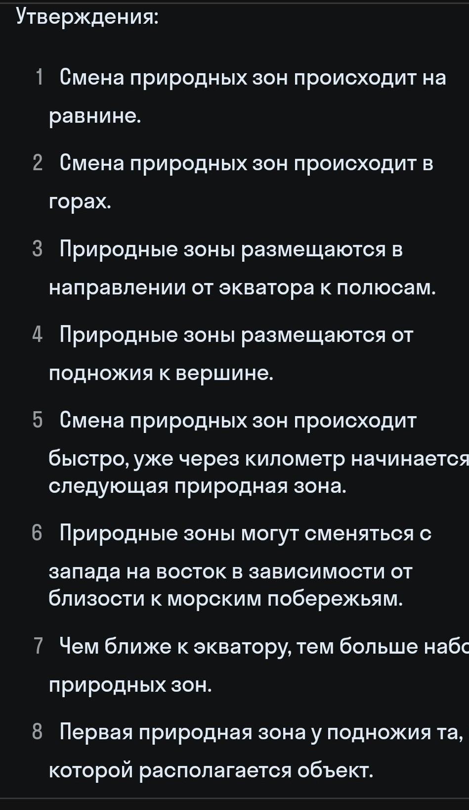 определите какие утверждения характеризуют широтную зональность , а какие высотную поясность , помогите пожалуйста !!! запишите цифрами