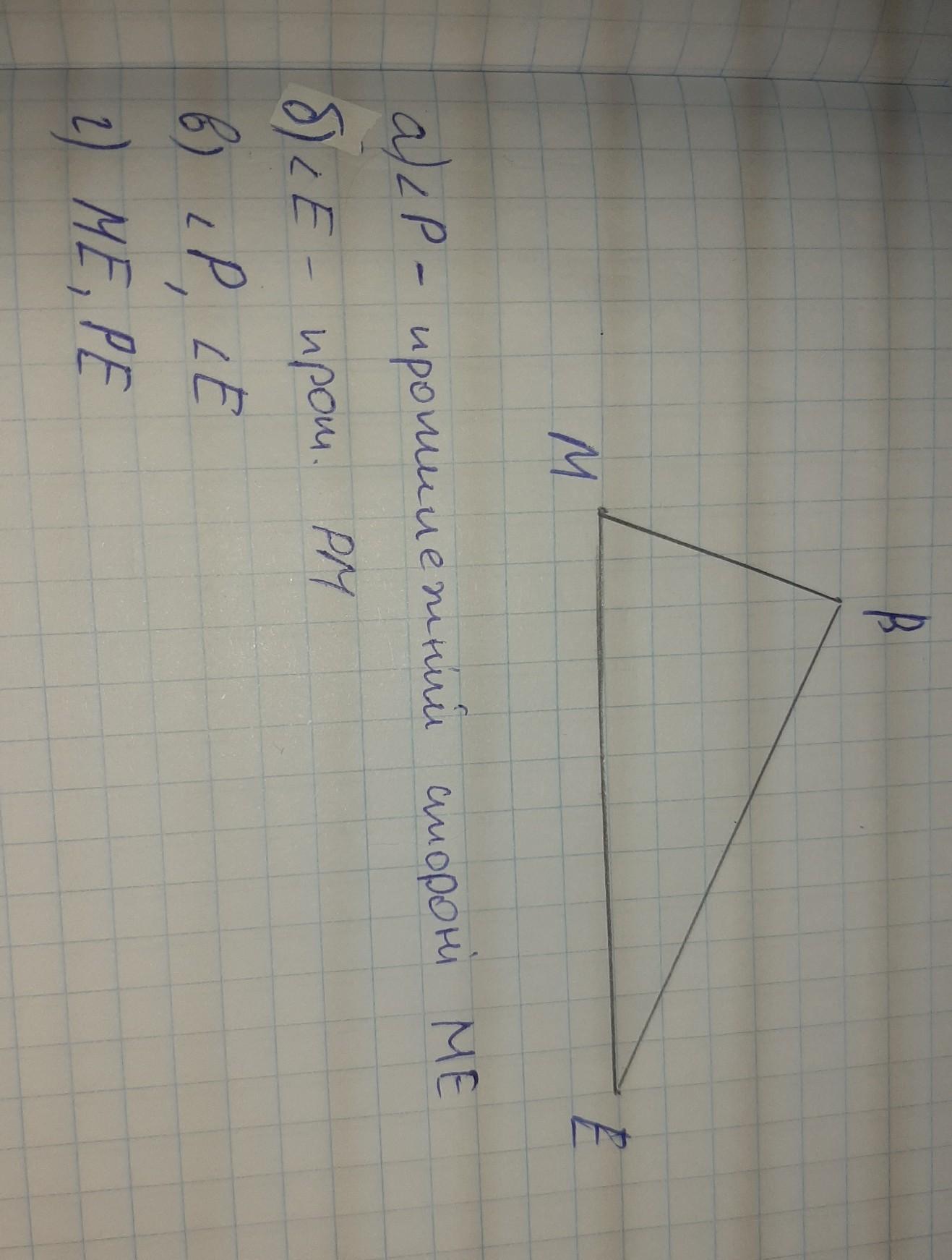 Накресліть довільний трикутник, позначте його вершини буквами М, Р і Е. Укажіть: а) сторону, протилежну куту Р; б) кут, протилежний стороні РМ; в) кути, прилеглі до сторони РЕ; г) сторони, прилеглі до кута Е.