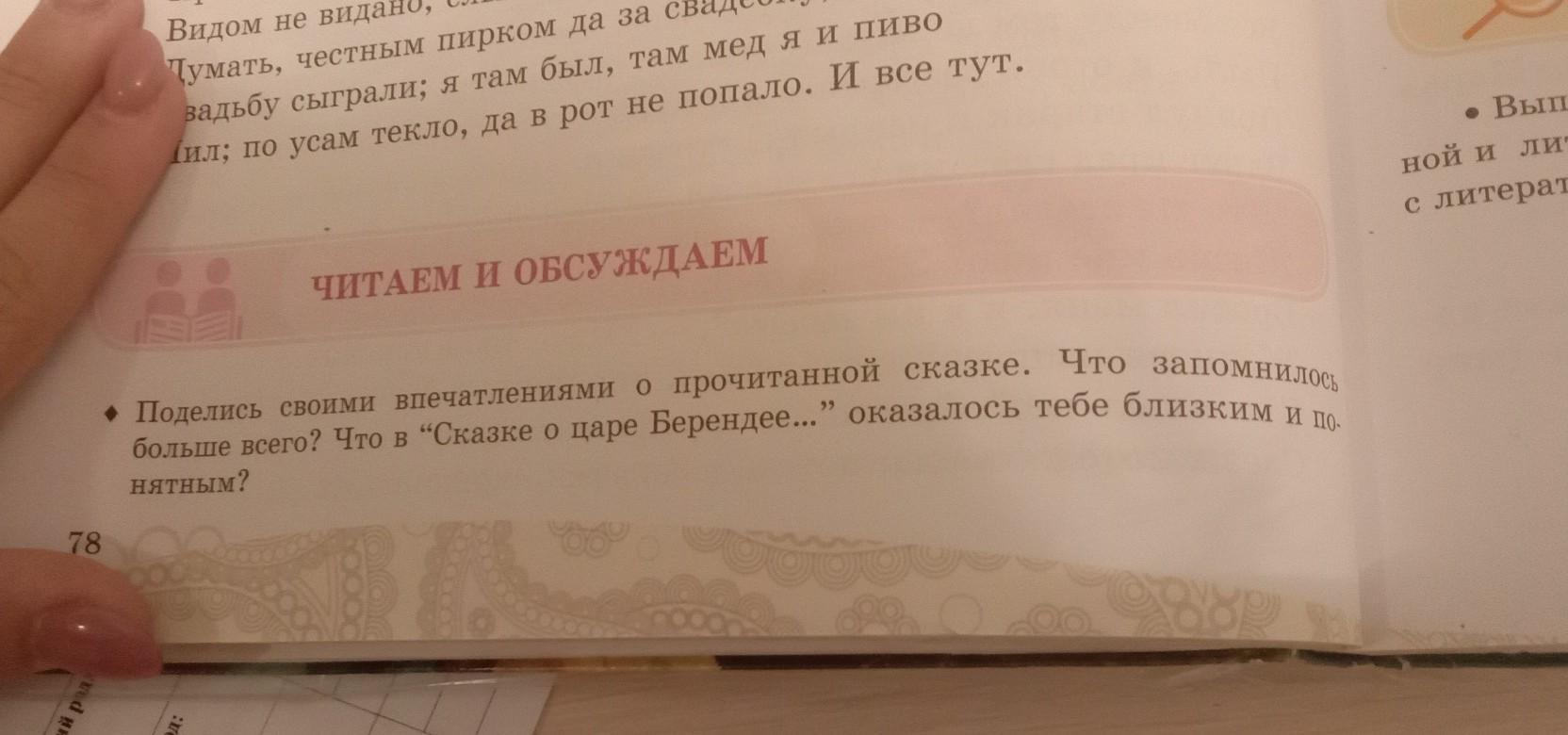 ЧИТАЕМ И ОБСУЖДАЕМ • Поделись своими впечатлениями о прочитанной сказке. Что запомнилось больше всего? Что в "Сказке о царе Берендее..." оказалось тебе близким и по- нятным?НАПИСАТЬ КРАТКО 78 ПОМОГИТЕ ПОЖАЛУЙСТА ЕСЛИ НЕ ЗНАЕТЕ НЕ ПЕШИТЕ Дам 20 БАЛОВ