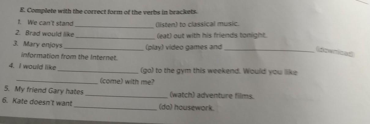 1listening2to eat3 playing downloading 4to go to come 5watching6to do