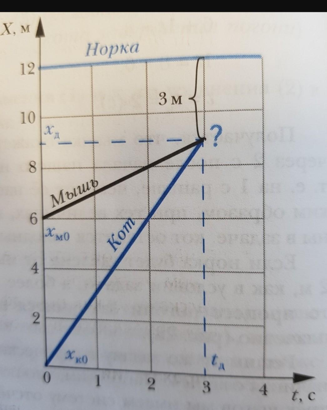 По графикам в прикрепленном файле, составить задачу. Сформулировать разные вопросы к задаче. Решить задачу. Дать ответы на поставленные вопросы. Записать зависимость координаты движения мыши и кота.