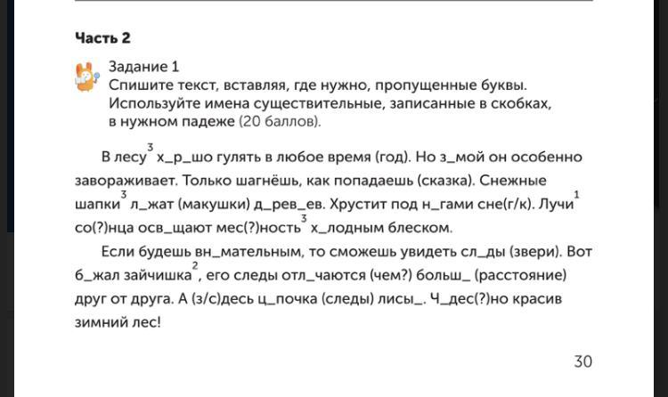 Ответ:Хорошо, зимой, лежат, деревьев, ногами, снег, солнца, освещают, местность, холодным, внимательным, следы, бежал, отличаются, большим, здесь, цепочка, чудесно ( это пропуски и там где надо вставить буквы)