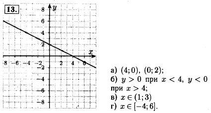 13 Постройте график функции y = -0,5х + 2. С помощью графика найдите: а) координаты точек пересечения прямой с осью хи осью у; б) значения аргумента, при которых у > 0, у < 0; в) значения у, которые соответствуют значениям х, удовлетворя- ющим неравенству -2 < x < 2; г) промежуток, которому принадлежит переменная х, если учаим = -1, У наиб = 4.