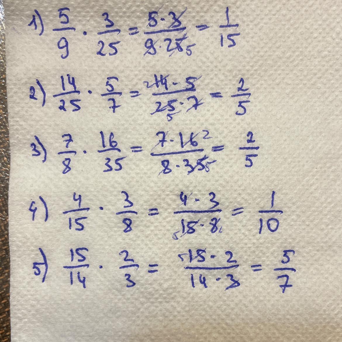 355. 1) 5/9 * 3/25 2) 14/25 * 5/7 3) 7/8 * 16/35 4) 4/15 * 3/8 5) 15/14 * 2/3